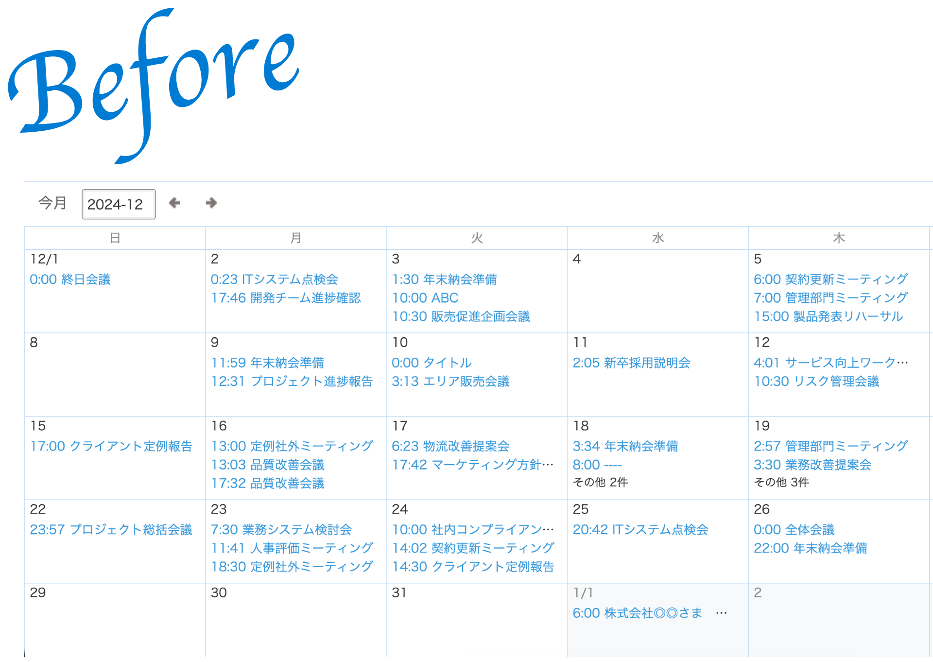 kintone標準のカレンダーでは、全体の予定を一覧で把握できず、部署ごとの予定確認にも毎回切り替えや検索が必要でした。「他部署の予定を見たいだけなのに、いちいち画面を行き来しないといけない」そんな小さな手間が積み重なり、調整にも時間がかかっていました。