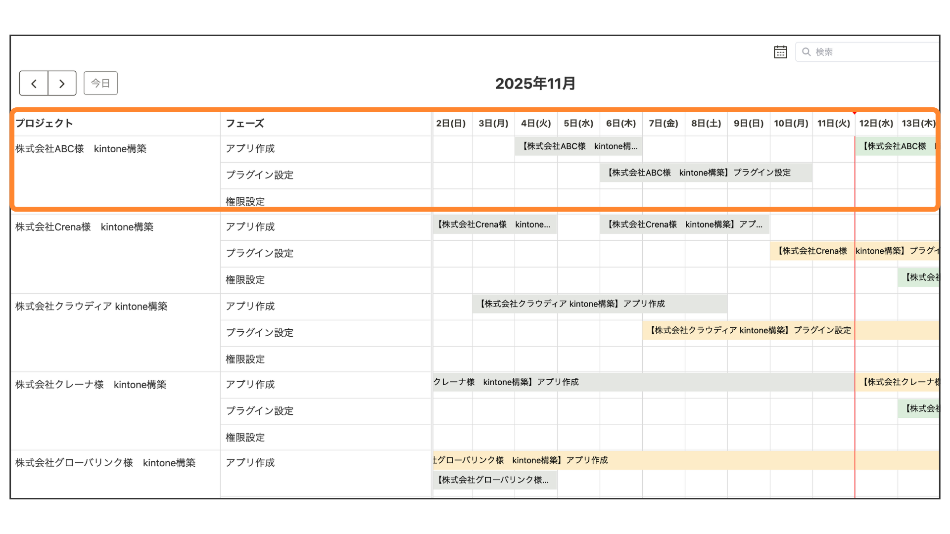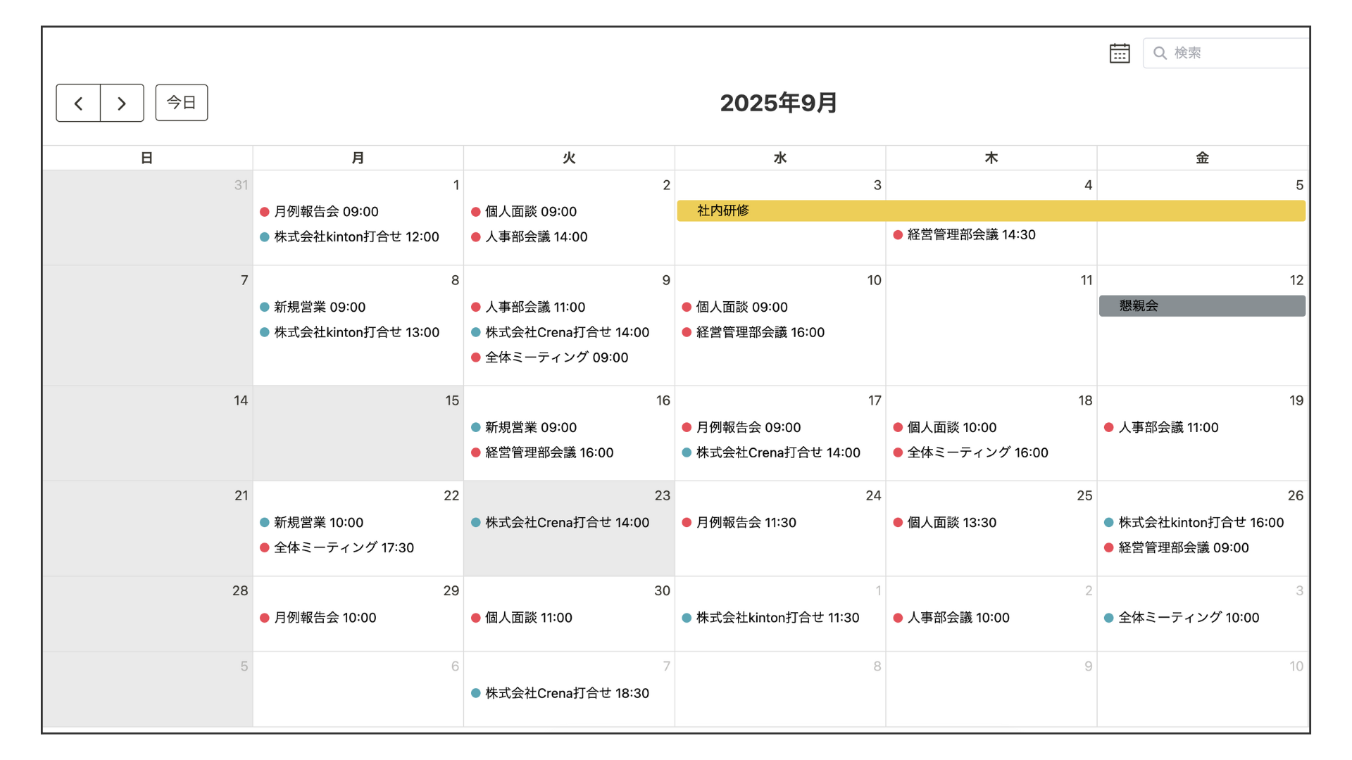 そんな中、カレンダープラグインを試したところ、人別・部署別に色分け表示でき、どのチームがいつどんな予定を入れているのかがひと目で把握可能に。週ごと・月ごとの表示切り替えもスムーズで、マネージャー層からも「全体が見やすくなった」と好評です。
