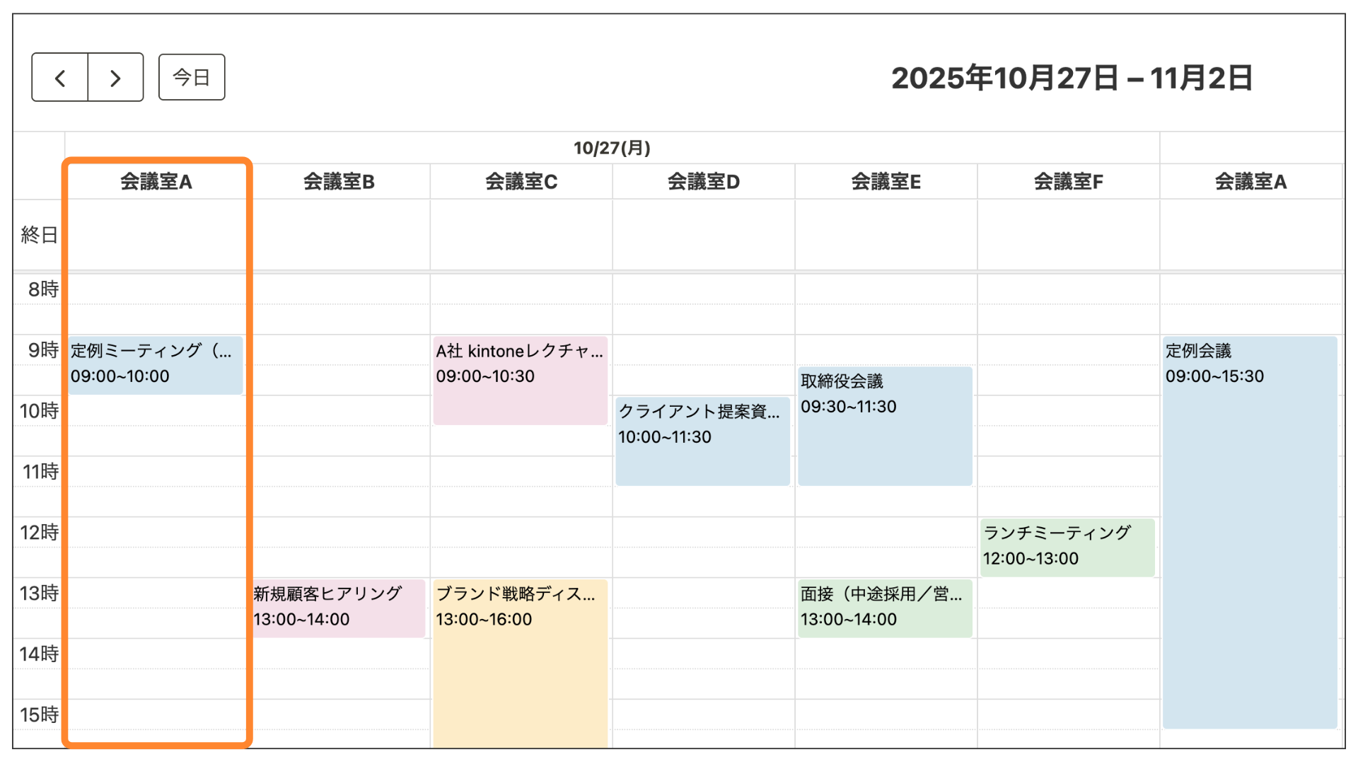 このプラグイン導入後は、会議室ごとにカレンダー表示ができ、時間単位での予約状況を視覚的に確認可能に。予約済みの時間帯はバーで表示され、空き枠も一目で把握できます。複数会議室の予定も同時に確認できるため、予約ミスや時間かぶりの防止にも直結。標準ではできなかった“リソース単位の見える化”が、導入の決め手になりました。